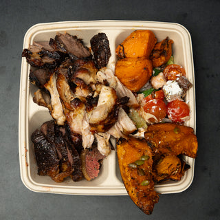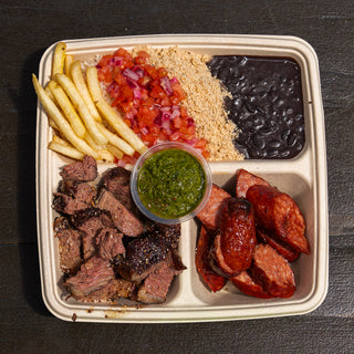 A full-flavoured Brazilian-style feast featuring two BBQ meats, rice, beans, tomato salsa, farofa, chips, and your favourite sauce.