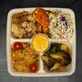 A vibrant, satisfying combo of your choice of roasted veggies and two fresh, house-made salads.