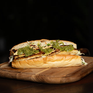 A warm bread roll packed with golden grilled halloumi, crunchy coleslaw, zesty tomato salsa, and your choice of sauce — fresh and full of flavour.