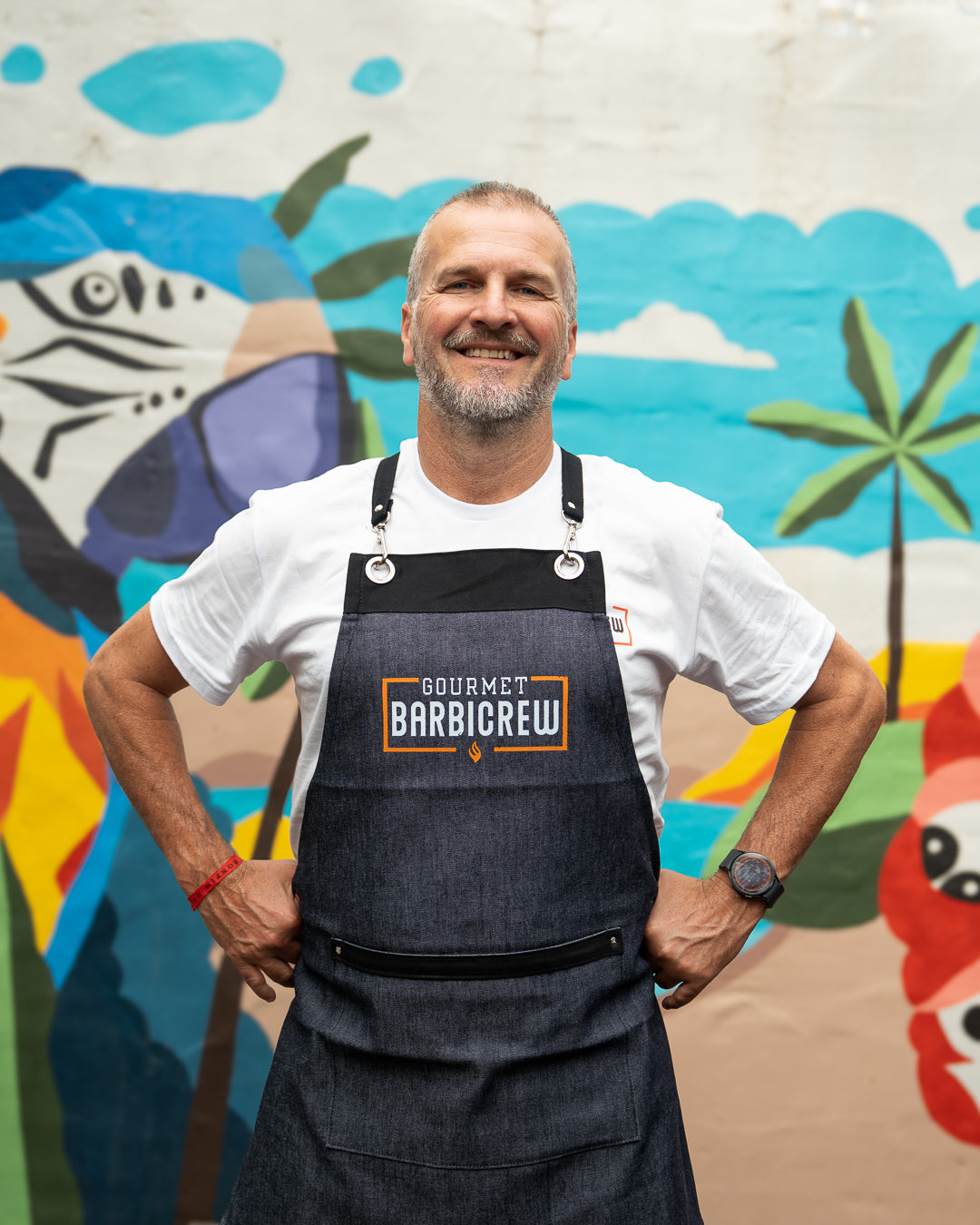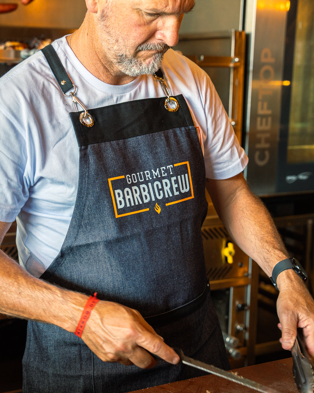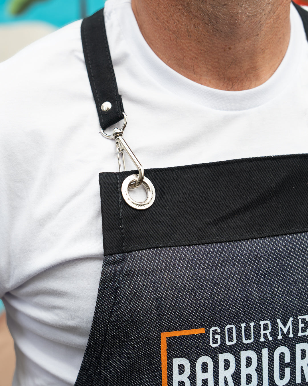 Dark denim apron with a bold “Gourmet Barbicrew” embroidered logo