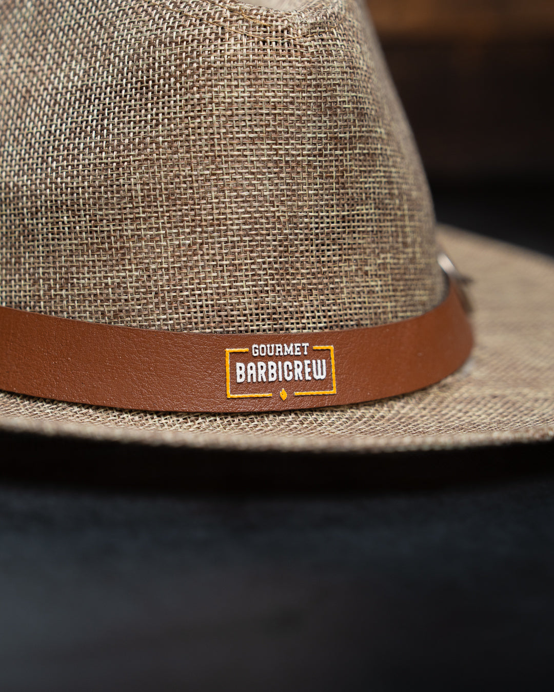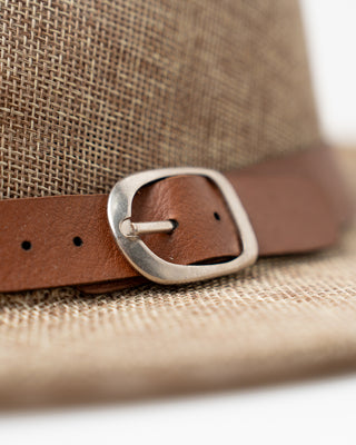 - Features a brown belt-style band around the crown for a refined finishing touch